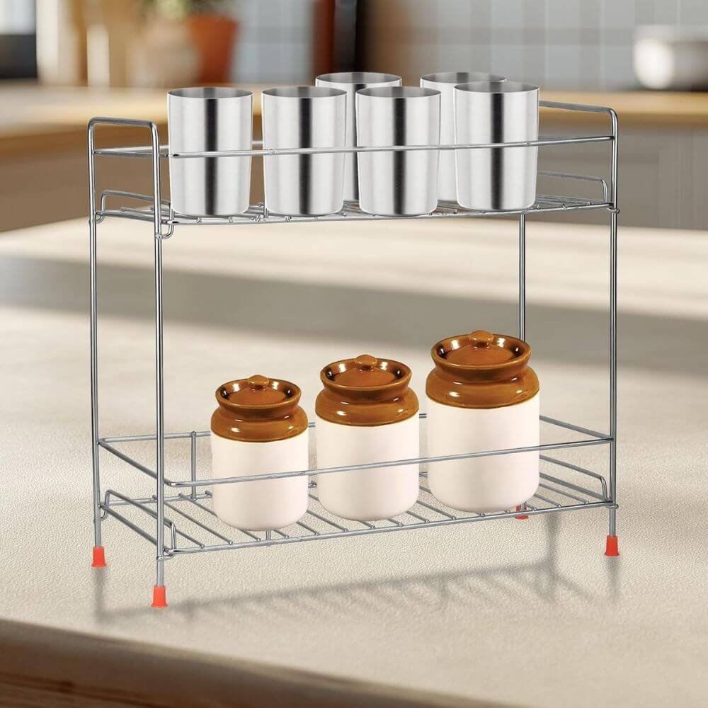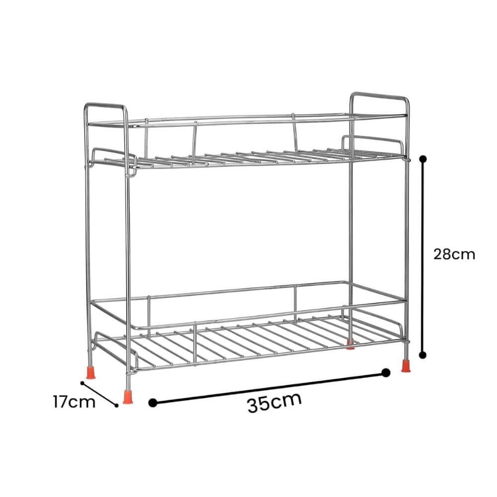 • 🗹 The Size Of This Spice Rack Is 35 x 17 x 27 cm, So It Is Easy To Hold Various Bottles, Cans, Jars, Etc. The 2-Tier Design Of This Spice Rack Shelf Is Aimed At Saving Your Space But Holding More Items. Item Weight : 700 gm