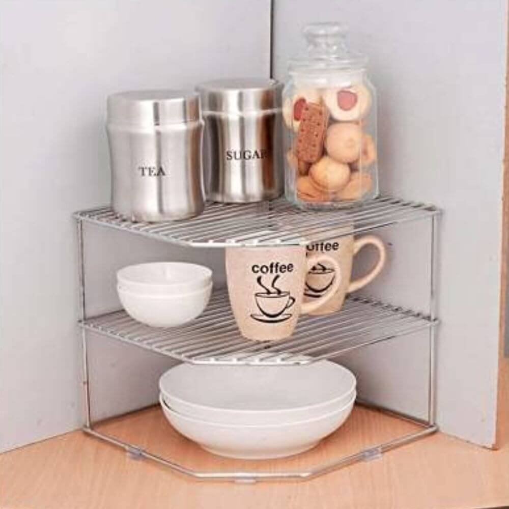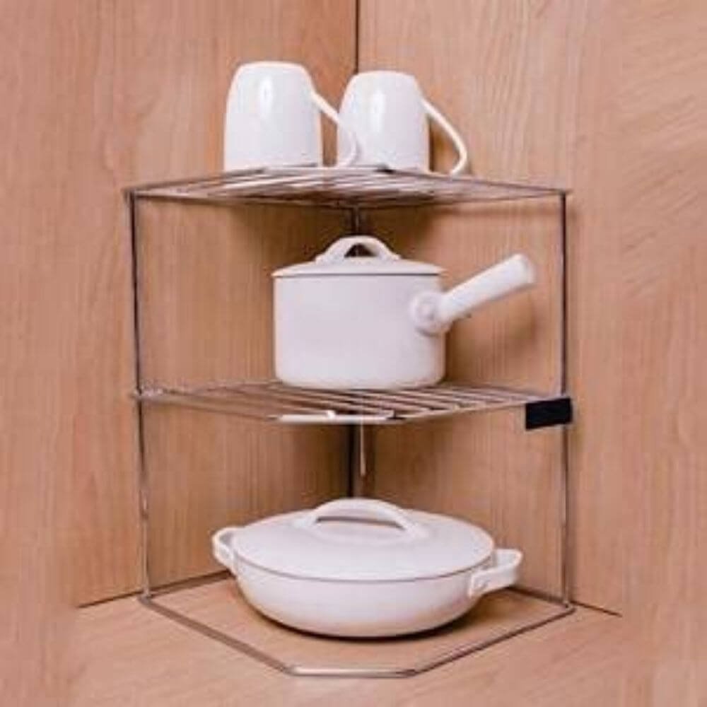 - Boost your kitchen cupboard storage quickly and easily with this three-tier corner plate rack. It maximises the vertical space in any cupboard, counter or under sink area with a large surface area suitable for plates of all sizes and other kitchen essentials. Crafted from robust stainless steel with a sleek chrome finish. It is 100% rust free!