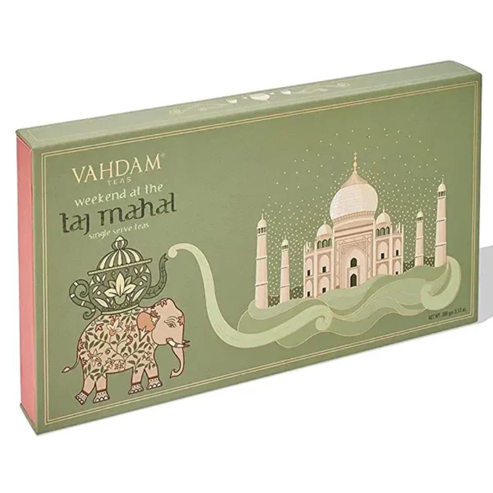 The tea gift set comes in beautifully designed packaging inspired by the Taj Mahal theme. It is suitable for festivals, birthdays, weddings, and corporate gifting.